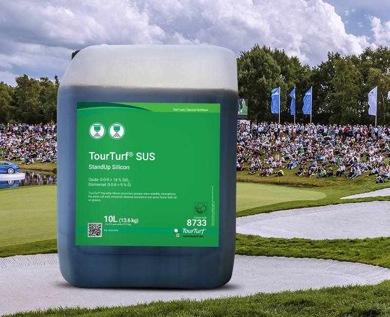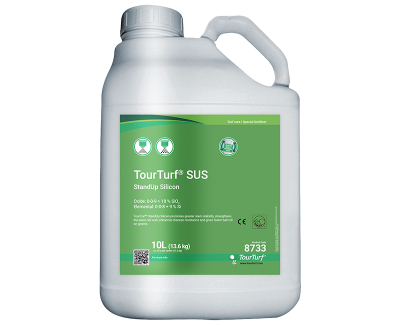 TourTurf® SUS StandUp Silicon ist ein flüssiger K-Dünger mit Silizium. SUS fördert das Wachstum und die Entwicklung von Rasen in Zeiten von Pflanzenstress und Trockenheit. Das Produkt sorgt für stärkere Zellwände und steifere Blätter, was zu einem schnelleren Ballroll auf Grüns, einer höheren Toleranz gegenüber Umwelteinflüssen sowie einer geringeren Anfälligkeit der Pflanzen für Schädlinge und Pilzkrankheiten führt.