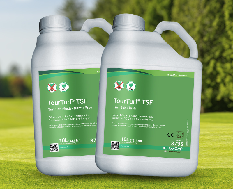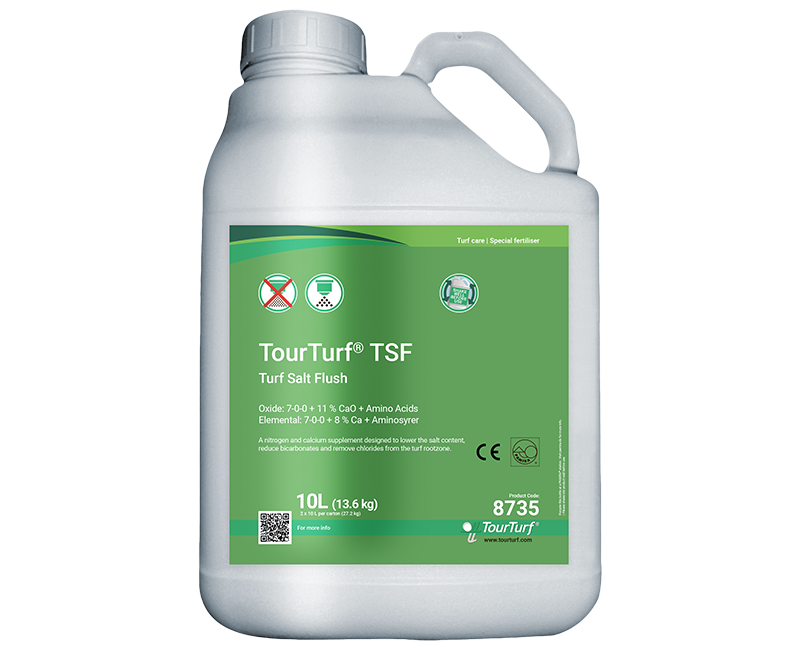 TourTurf® TSF Turf Salt Flush ist ein Kalzium- und Biostimulanzienzusatz für Rasenflächen, der den Salzgehalt senkt und vorhandene Bikarbonate und Chloride im Wurzelbereich reduziert, was zu gesünderen Rasenpflanzen führt. TSF Turf Salt Flush gleicht den Salzgehalt im Wurzelbereich des Rasens aus, sodass die Pflanze Wasser ohne erhöhten osmotischen Druck (Salzstress) aufnehmen kann.