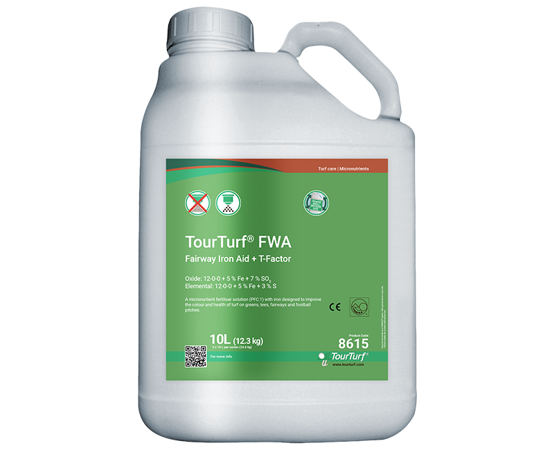 TourTurf® FWA Fairway Iron Aid + T-Factor er en flydende N-gødning med jern, svovl og triacontanol. Produktet består af en synergistisk blanding af urea-kvælstof og en effektiv jernkilde. Produktet giver næring til græsset, og dets pH-værdi på 3 hjælper med at forsure jordprofilen. Opløsningens pH-værdi i sprøjtetanken forbliver på et lavt niveau, selv når den fortyndes med vand. FWA er designet til at forbedre farven og sundheden af græs på greens, teesteder, fairways og fodboldbaner.