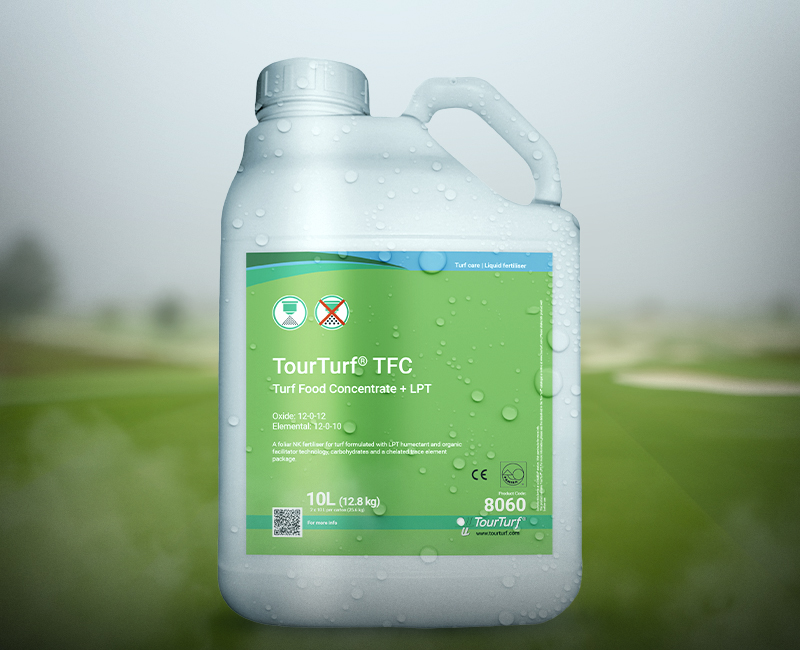 TourTurf® TFC Phosphor Zero 12-0-12 Turf Food Concentrate + LPT is a foliar fertiliser for turf designed for quick leaf uptake of nutrients under different environmental conditions. From both low soil temperatures to high air temperatures with high humidity.