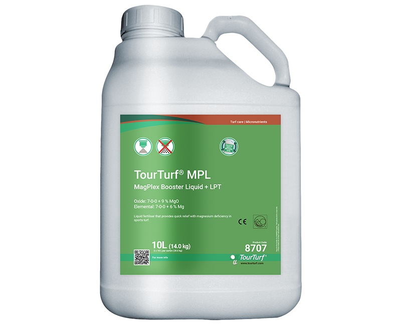 TourTurf® MPL MagPlex Booster Liquid + LPT Leaf Penetrant Technology is a liquid N-fertiliser with magnesium and carbohydrates for the treatment of magnesium deficiency on turf. The formulation encourages rapid uptake via turf leaves and roots. Also contains aromatic plant extracts for enhanced turf resiliency. Use TourTurf® MPL to get great colour without the extensive use of iron, to replenish magnesium in stadiums using artificial light year round and to correct any deficiencies.
